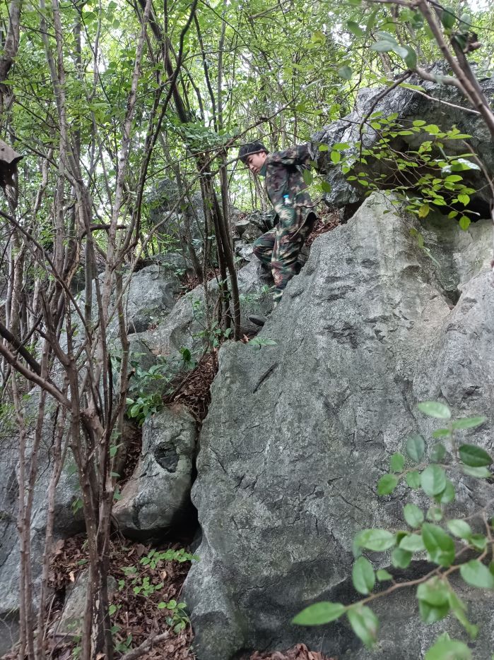 初到現(xiàn)場,沒有測繪人員引路,沒有地形地貌指示,沒有上山蹤跡可循,一切只得靠項(xiàng)目組成員自己去探索、去開拓,用腳步踏出一條條路,用身體力行去征服原始深山。由于缺乏上山經(jīng)驗(yàn),缺少開路工具,大家初始只能借助木棍在灌木叢生、荊棘遍布的深山中開墾出一條路。